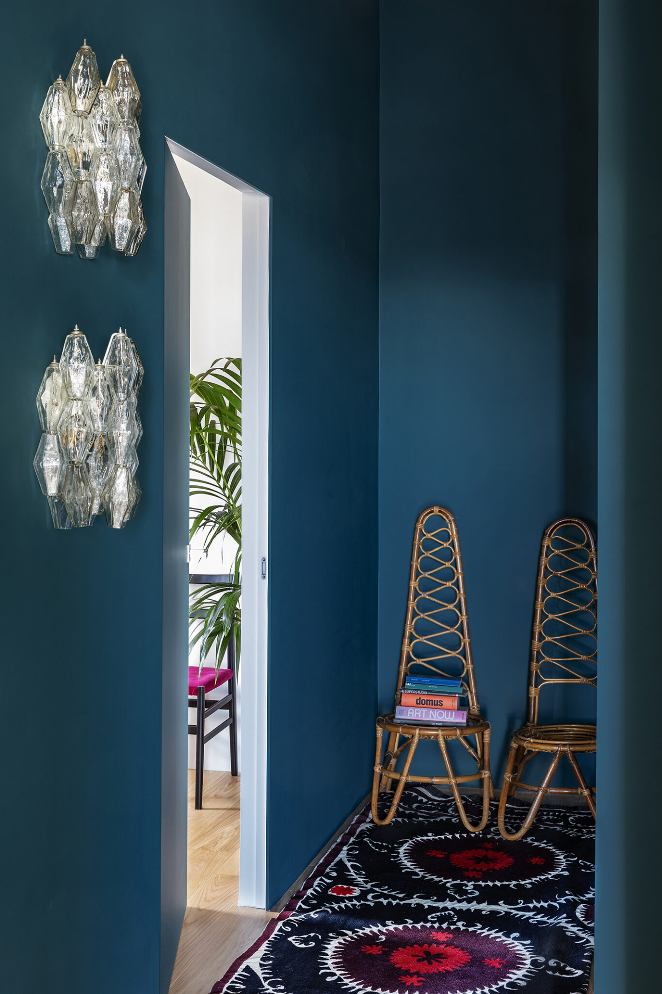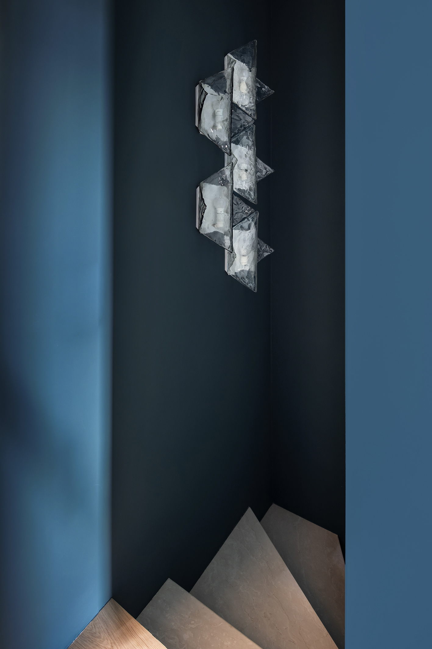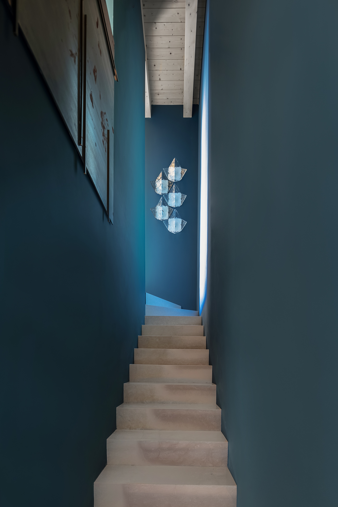 A sorpresa, il lungo vano scale d'accesso al piano superiore si tinge di un blu notte molto intenso, a netto contrasto con l'ottimamente esposta zona giorno. Le porte a scomparsa si perdono nella profondità cromatica, celando i vari ambienti notte: tre camere, uno studio e due bagni. Alcuni arredi, su disegno, concepiti con i medesimi materiali completano questi spazi. Un arazzo tropical ed alcuni arredi space age selezionati creano una voluta dissonanza con la semplicità architettonica del contesto.