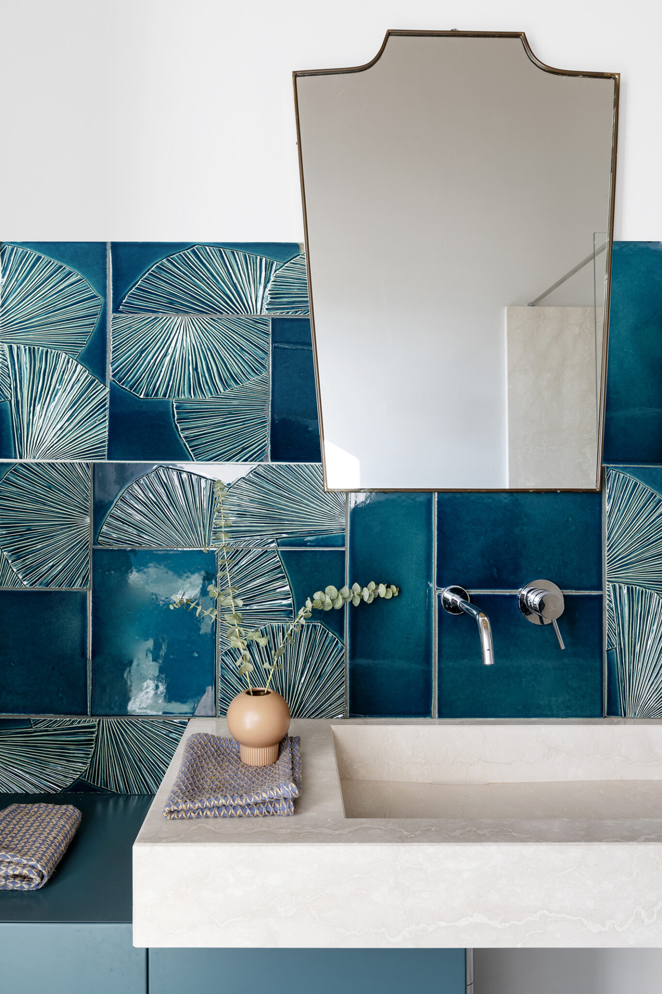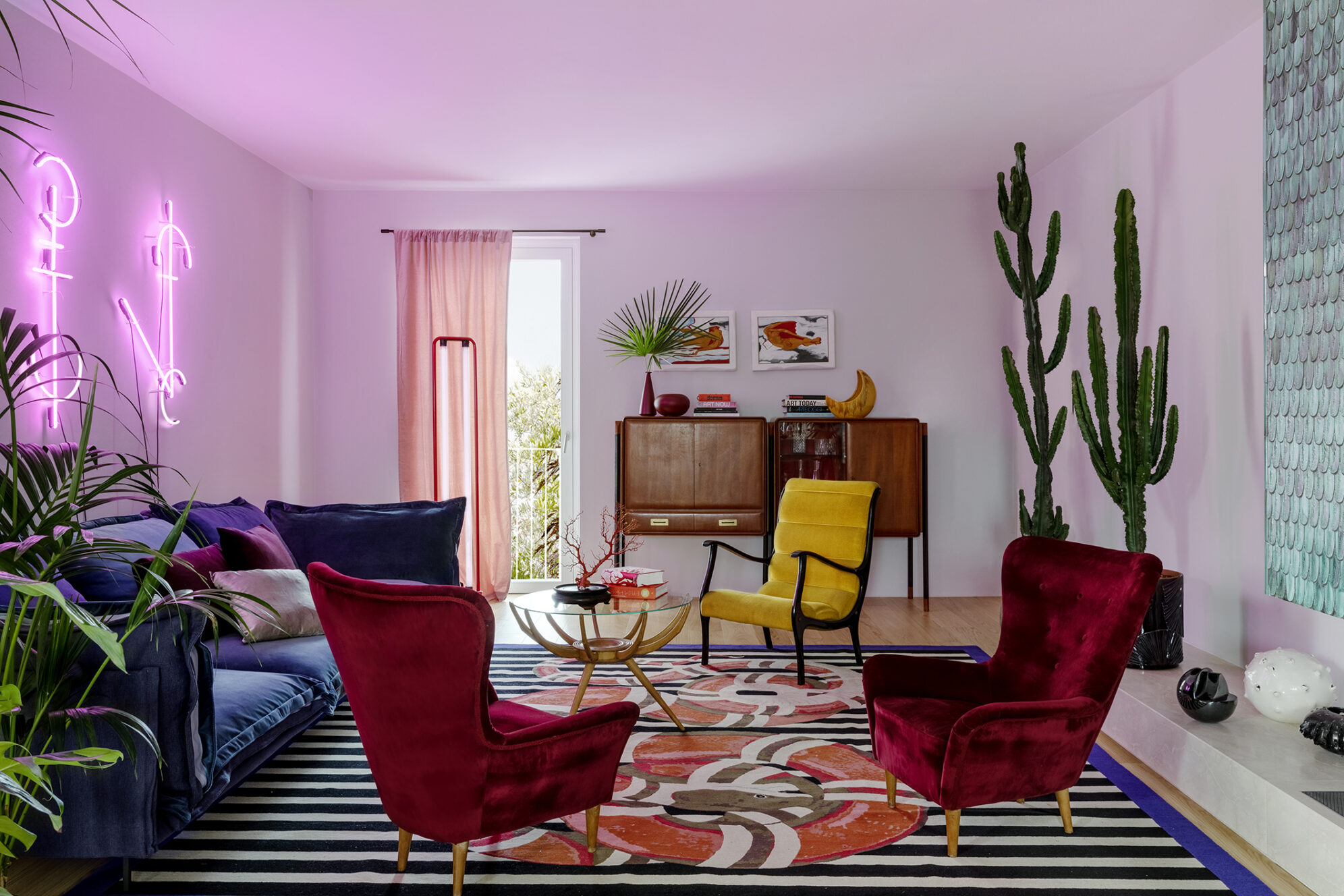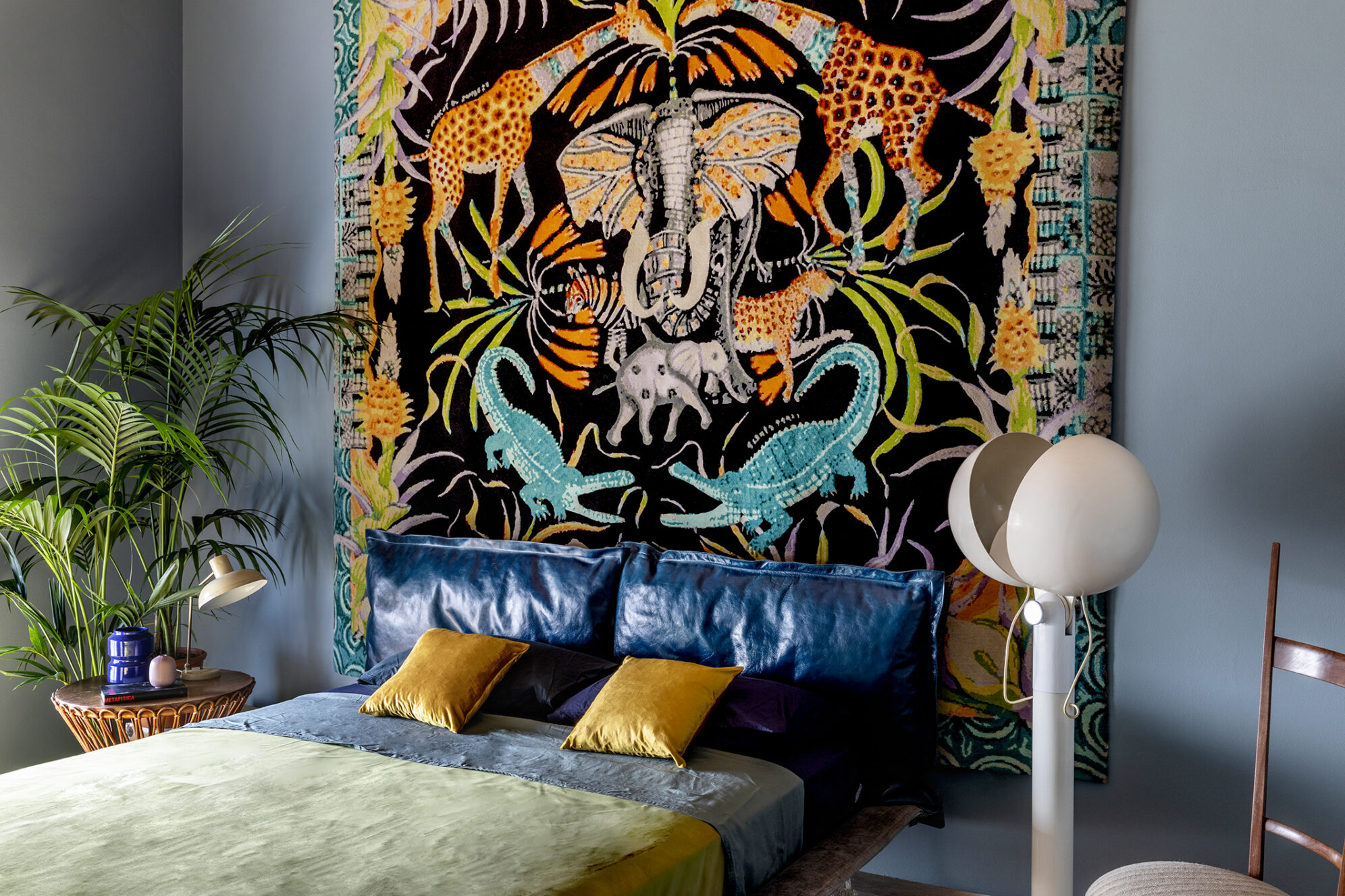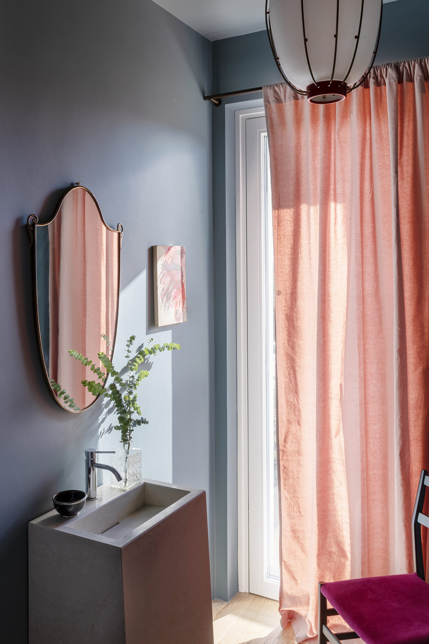 A sorpresa, il lungo vano scale d'accesso al piano superiore si tinge di un blu notte molto intenso, a netto contrasto con l'ottimamente esposta zona giorno. Le porte a scomparsa si perdono nella profondità cromatica, celando i vari ambienti notte: tre camere, uno studio e due bagni. Alcuni arredi, su disegno, concepiti con i medesimi materiali completano questi spazi. Un arazzo tropical ed alcuni arredi space age selezionati creano una voluta dissonanza con la semplicità architettonica del contesto.