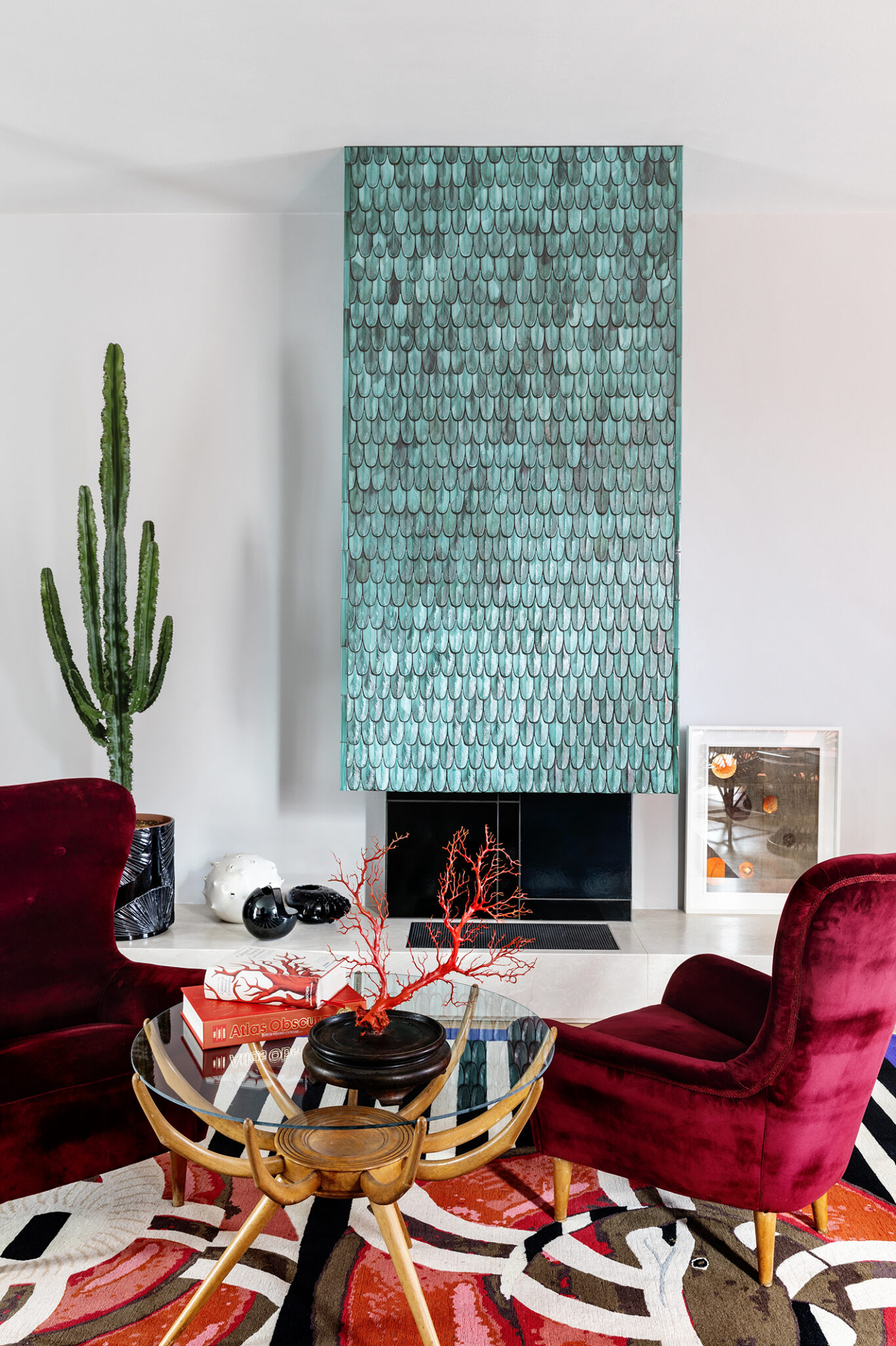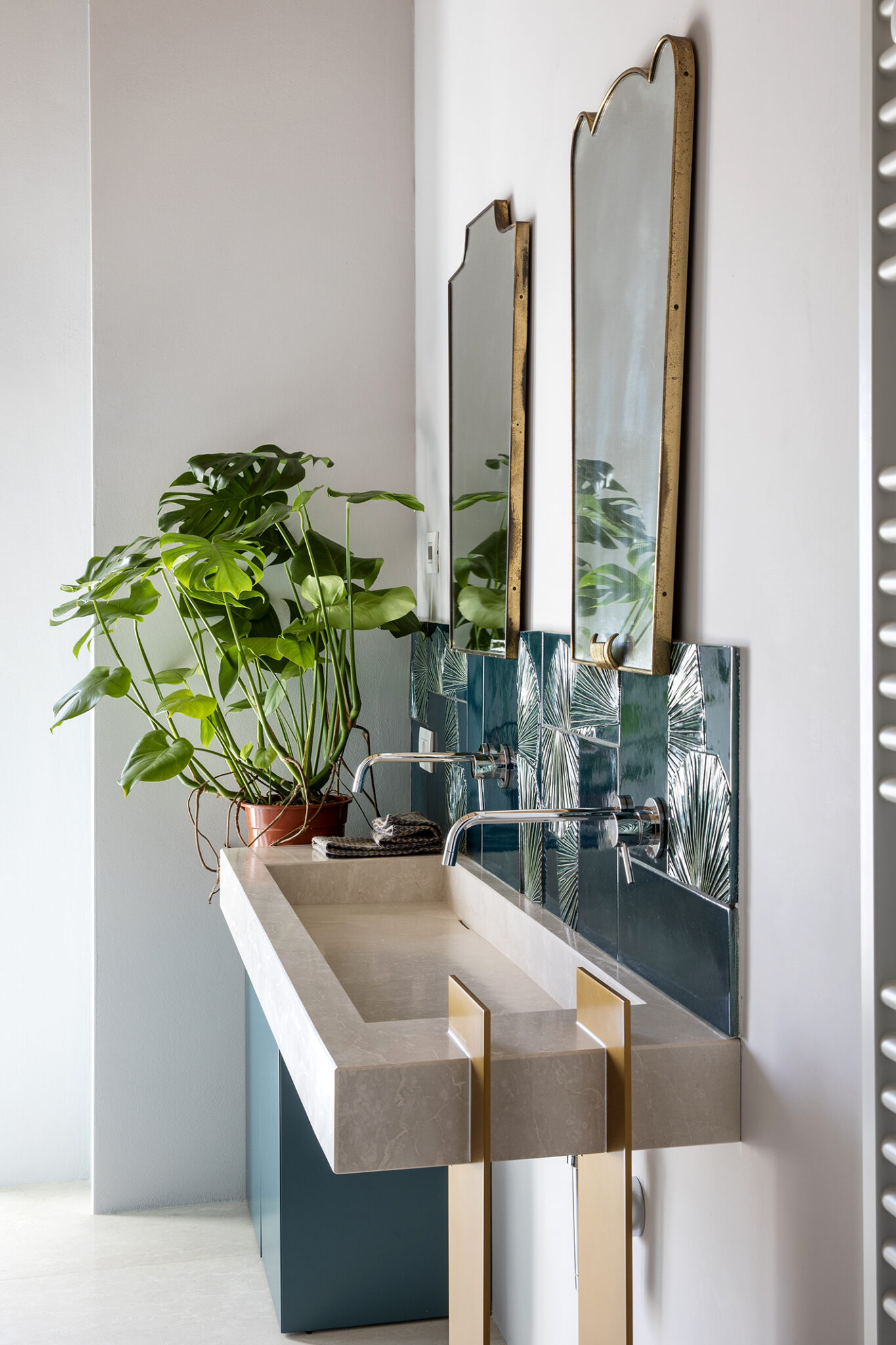 L'intervento fonde un mix di contaminazioni esotiche con l'eleganza del design italiano, il tutto incorniciato dall'utilizzo di pochi e semplici materiali proposti senza soluzione di continuità sui due piani dell'immobile. La scelta determina un parquet di rovere a listoni, un marmo botticino spazzolato e preziose manifatture ceramiche (prodotte nel famoso polo vicentino di Nove).Perno dell'area living, si rende protagonista il grande camino rivestito in mosaico ceramico di Bottega Nove, in contrapposizione al tappeto "Serpente", pezzo unico di Matteo Pala. Una selezione d'arredi e opere d'arte, dal contemporaneo agli anni '40, completano l'ambiente.