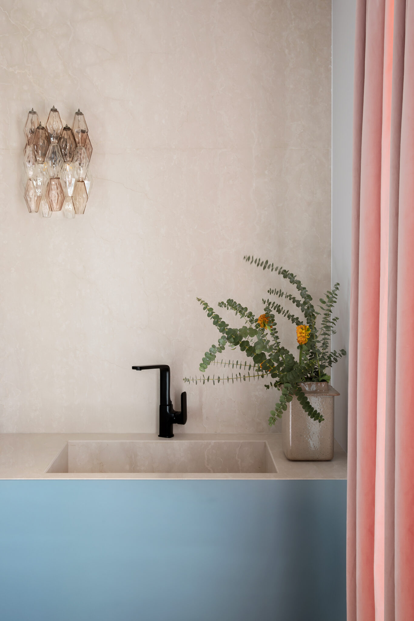 La cucina su disegno si fonde alla parete in Botticino, come il piano top e il basamento massiccio del grande tavolo. Un accenno al territorio si palesa con la presenza delle applique mod. Poliedri di Venini e delle sedie mod. Tulu di Kazuhide Takahama (che operò per un lungo periodo della sua vita nel territorio vicentino).
